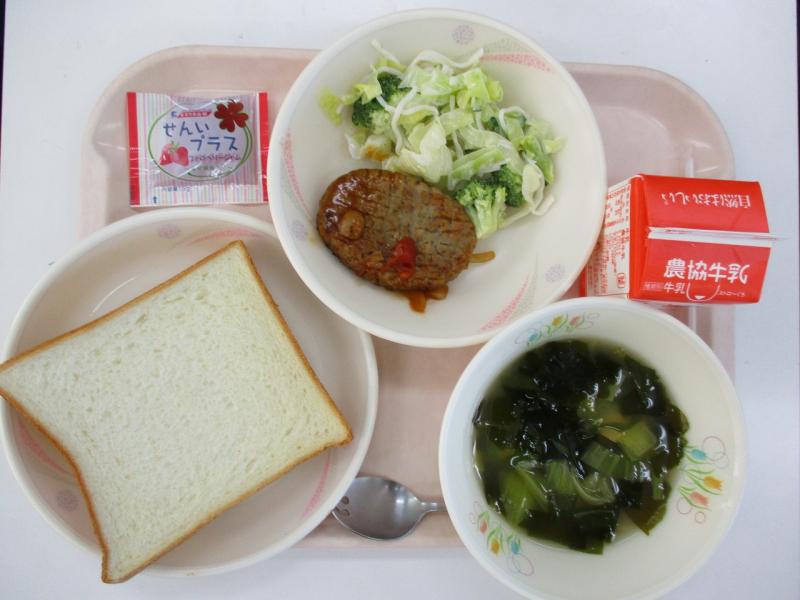~ミルク食パン、デミグラスハンバーグ、キャベツとかにかまのレモンサラダ、コーンとわかめスープ、牛乳~