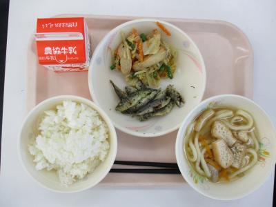 ~ごはん、豆アジの青のり風味、いんげんのごま和え、うどん汁、牛乳~