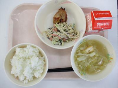 ~ごはん、揚げしゅうまい、野菜炒め、若竹汁、牛乳~