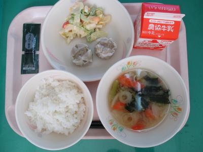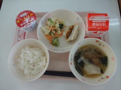 ~ごはん、焼きギョウザ、ブロッコリーサラダ、ワンタンスープ、牛乳、ヨーグルト~