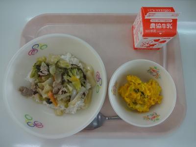 ~ごはん、かぼちゃシューマイ、ビーフン炒め、白菜スープ、牛乳、いちごゼリー~