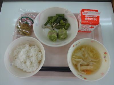 ~ごはん、枝豆シュウマイ、アスパラベーコン、キャベツのみそ汁、牛乳、抹茶ワッフル~