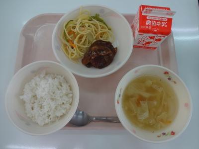 ~ごはん、デミグラスハンバーグ、スパゲッティソテー、コンソメスープ、牛乳~