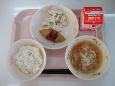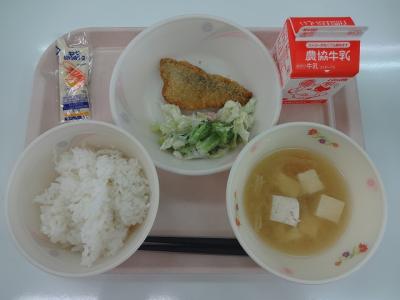~ごはん、アジフライ、ハムとキャベツのサラダ、みそ汁、牛乳~