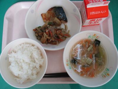 ~ごはん、さばみりん焼き、五目きんぴら、なめこのみそ汁、牛乳~