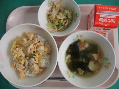 ~(麦飯)、親子丼、キャベツのごま和え、みそ汁、牛乳~