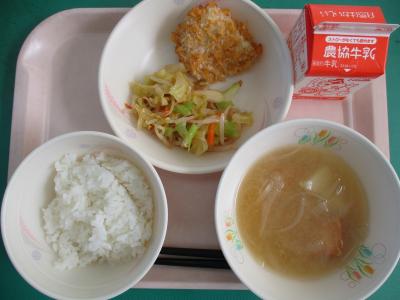 ~ごはん、揚げ魚の野菜炒め、じゃがいものみそ汁、牛乳、みかんゼリー~
