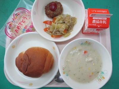 ~バターロール、ハンバーグ ケチャップ、野菜炒め、シチュー、牛乳、お祝いクレープ~