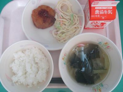 ~ごはん、コロッケ、マカロニサラダ、とうふのすまし汁、牛乳~