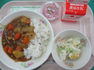 ~(麦飯)、カレーライス、ハムとキャベツの和え物、お祝いゼリー、牛乳~