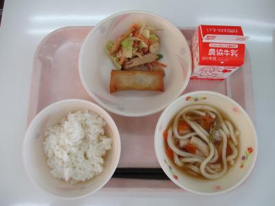 ~ごはん(減)、春巻き、いんげんのごま和え、うどん汁、牛乳~