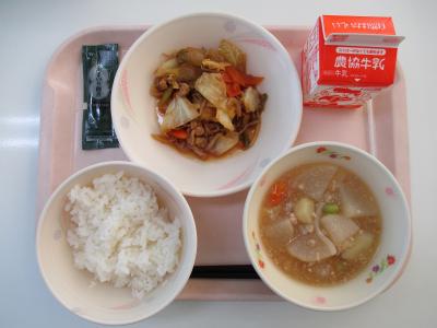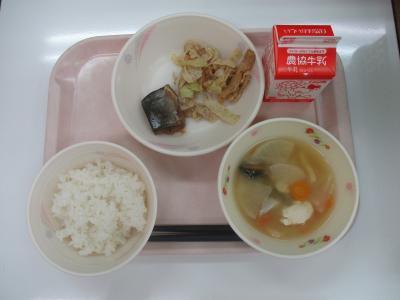 ~ごはん、さばみそ煮、ちくわとキャベツの和え物、豚肉の豆乳仕立て、牛乳~