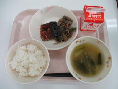 ~ごはん、ぶりの照り焼き、切干大根のそぼろ炒め、じゃがいものみそ汁、牛乳~