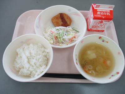 ~ミルクロール、ポークコロッケ、れんこんマヨサラダ、白菜のスープ、牛乳~