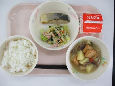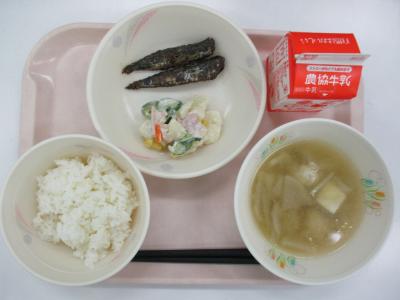 ~ごはん、浜炊きいわし、ポテトサラダ、とり団子汁、牛乳~