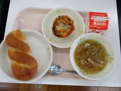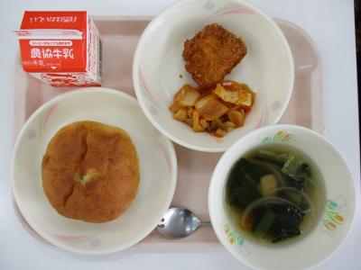 ~バターロール、かぼちゃコロッケ、スパゲッテイソテー、キャベツとたまごのスープ、牛乳~
