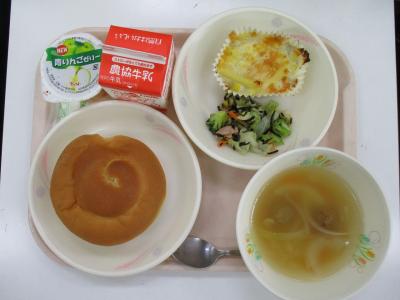 ~ミルクロール、マカロニグラタン、ひじきのサラダ、肉団子スープ、牛乳、青りんごゼリー~