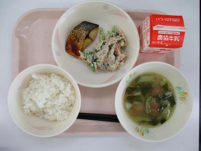 ~ごはん、さばの香味焼き、ふきのごまマヨ和え、とり団子汁、牛乳~