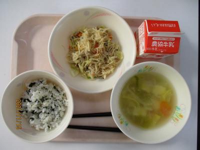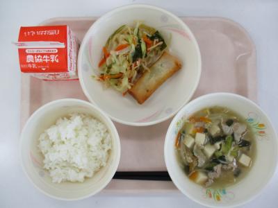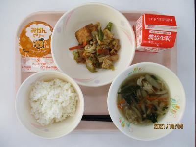 ~ごはん、厚揚げとキャベツのみそ炒め、沢煮椀、牛乳、みかんゼリー~