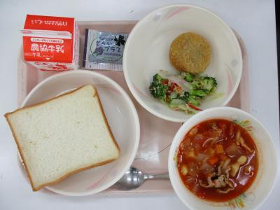 ~豆パン、チキンカツ、しめじとトマトのラタトゥイユ、ウインナーと野菜のスープ、牛乳~
