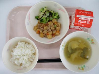 ~ごはん、あげじゃがのそぼろあん、野菜の昆布あえ、とうふのみそ汁、牛乳~