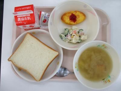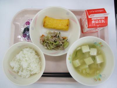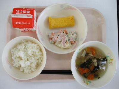 ~わかめごはん、あつやきたまご、春雨サラダ、じゃがいものみそ汁、牛乳~