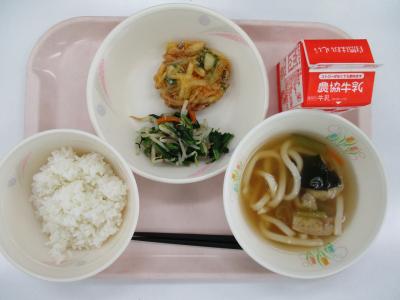 ~ごはん、野菜のかき揚げ、あかか和え、五目うどん汁、牛乳~