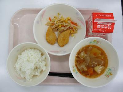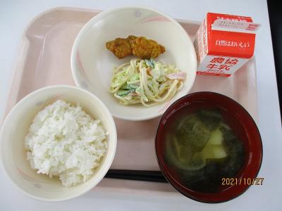 ~ごはん、輪島ふぐのカレー揚げ、スパゲッティサラダ、じゃがいものみそ汁、牛乳~