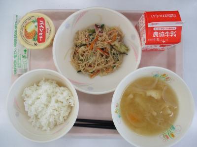~ごはん、いか入りビーフン炒め、じゃがいもと油揚げのみそ汁、牛乳、パインゼリー~