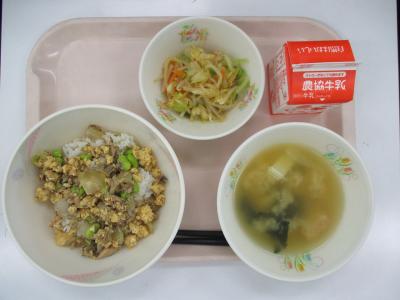 ~麦飯、そぼろ丼、切干大根のうま煮、じゃがいもと油揚げのみそ汁、牛乳~