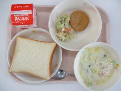 ~コッペパン、ウインナー、キャベツとコーンのサラダ、ミルクスープ、牛乳~