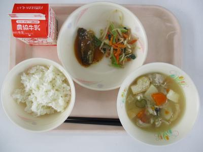 ~ごはん、いわしのみそ煮、小松菜の和え物、豚汁、牛乳~