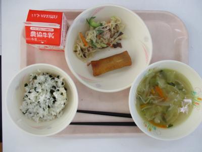 ~わかめごはん、春巻き、切干大根の中華サラダ、肉団子のスープ煮、牛乳~