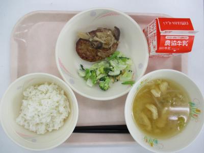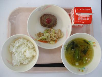 ~ごはん、ハンバーグ、キャベツのごま和え、かぼちゃのみそ汁、牛乳~