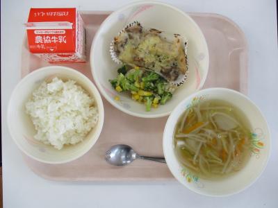 ~ごはん、海女どりさざえグラタン、ブロッコリーのサラダ、もやしスープ、牛乳~