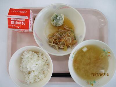 ~ごはん、野菜しゅうまい、五目きんぴら、キャベツのみそ汁、牛乳~