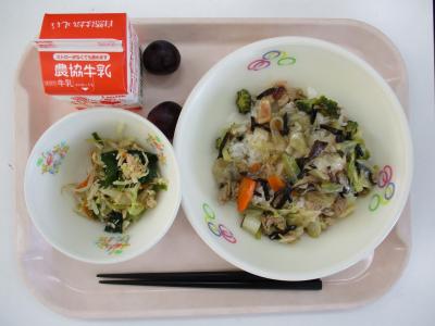 ~ごはん、さつまいもと煮干しのごまがらめ、花野菜とツナのサラダ、具だくさん汁、牛乳~