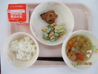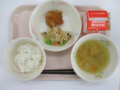 ~ごはん、チキンカツ、たまごと春雨のスープ、小松菜のスープ、牛乳~