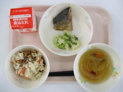 ~ごはん、ふくらぎの西京焼き、からしあえ、野菜の炊き合わせ、牛乳~