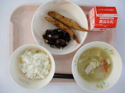 ~ごはん、子持ちししゃもフライ、ひじきの炒め煮、めった汁、牛乳~
