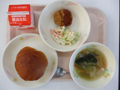 ~バターロール、メンチカツ、マカロニサラダ、ウインナーと野菜のスープ、牛乳~