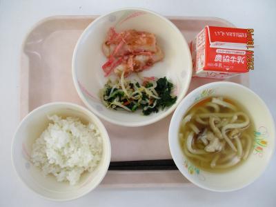 ~ごはん、ちくわの紅生姜揚げ、おかか和え、五目うどん汁、牛乳~