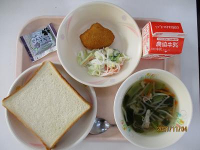 ~胚芽食パン、チキンカツ、コールスローサラダ、春雨のスープ、牛乳~