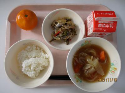 ~ごはん、豆あじの南蛮漬け、肉じゃが、牛乳、みかん~