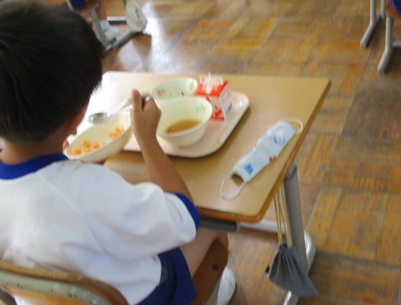 写真のように感染症対策のため、高学年以外は各教室で食べてます。来週より、以前のようにランチルームでみんなで食べることになります。 |