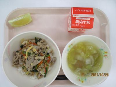 ~(麦飯)、ビビンバ丼、ワンタンスープ、牛乳、グレープフルーツ~
