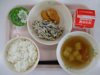 ~ごはん、とびうおのフライ、ひじきのサラダ、野菜と大豆のコーンスープ、牛乳~