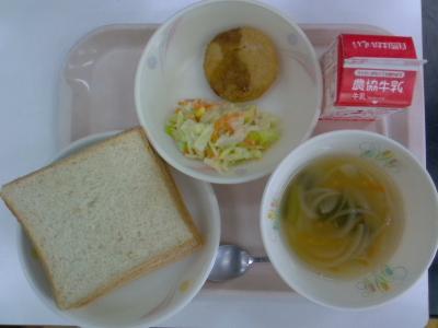 ~食パン、ジャム、ミートボールケチャップあん、コールスローサラダ、ゴロっとコンソメ煮、牛乳~