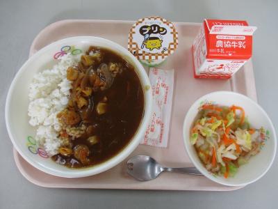 ~(麦飯)、豚ひき肉のカレー、キャベツのレモン和え、オレンジ、牛乳~