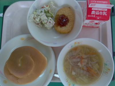~ミルクロール、ポークコロッケ、れんこんマヨサラダ、白菜のスープ、牛乳~